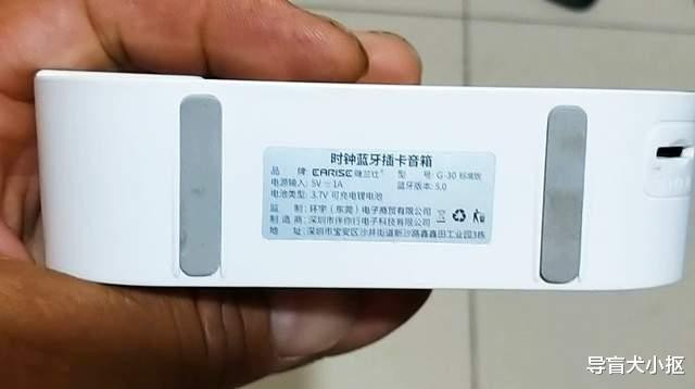 也就是说,作为蓝牙扬声器,G-30的核心配置除了蓝牙模块,就是正面的屏幕分区。镜面玻璃完整覆盖,右边靠下位置水平丝印了几个按键,分别是设置、模式、上下曲切换、菜单等,它们的键帽仅有米粒大小,一行布局,间距大,白色丝印的痕迹非常突出。从按键的位置也能猜测出,它们并非实体按键,而是与玻璃融为一体的电容键,手指点触操作,依靠轻微的震动判断点按效果,体验一般,并且手上有汗渍、水渍时还会触控不灵敏。